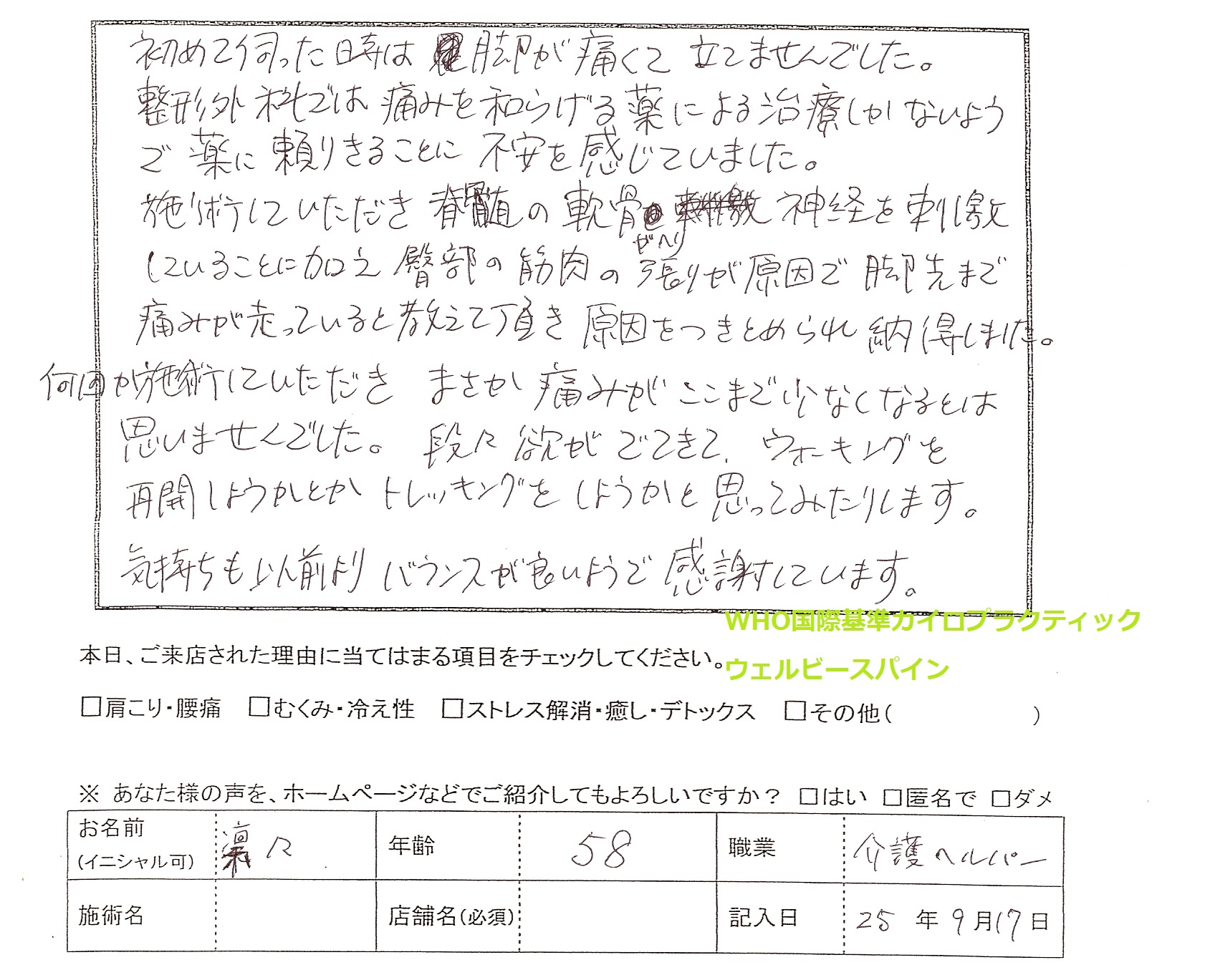 施術をして頂き脊髄(脊椎)の軟骨が減り神経を刺激していることに加え臀部の筋肉の張りが原因で脚先まで痛みが走っていると教えて頂き原因を突き止められ納得しました。何回か施術をして頂きまさか痛みがここまで少なくなるとは思いませんでした。段々欲が出てきて、ウォーキングを再開しようかトレッキングをしようかと思ってみたりします。