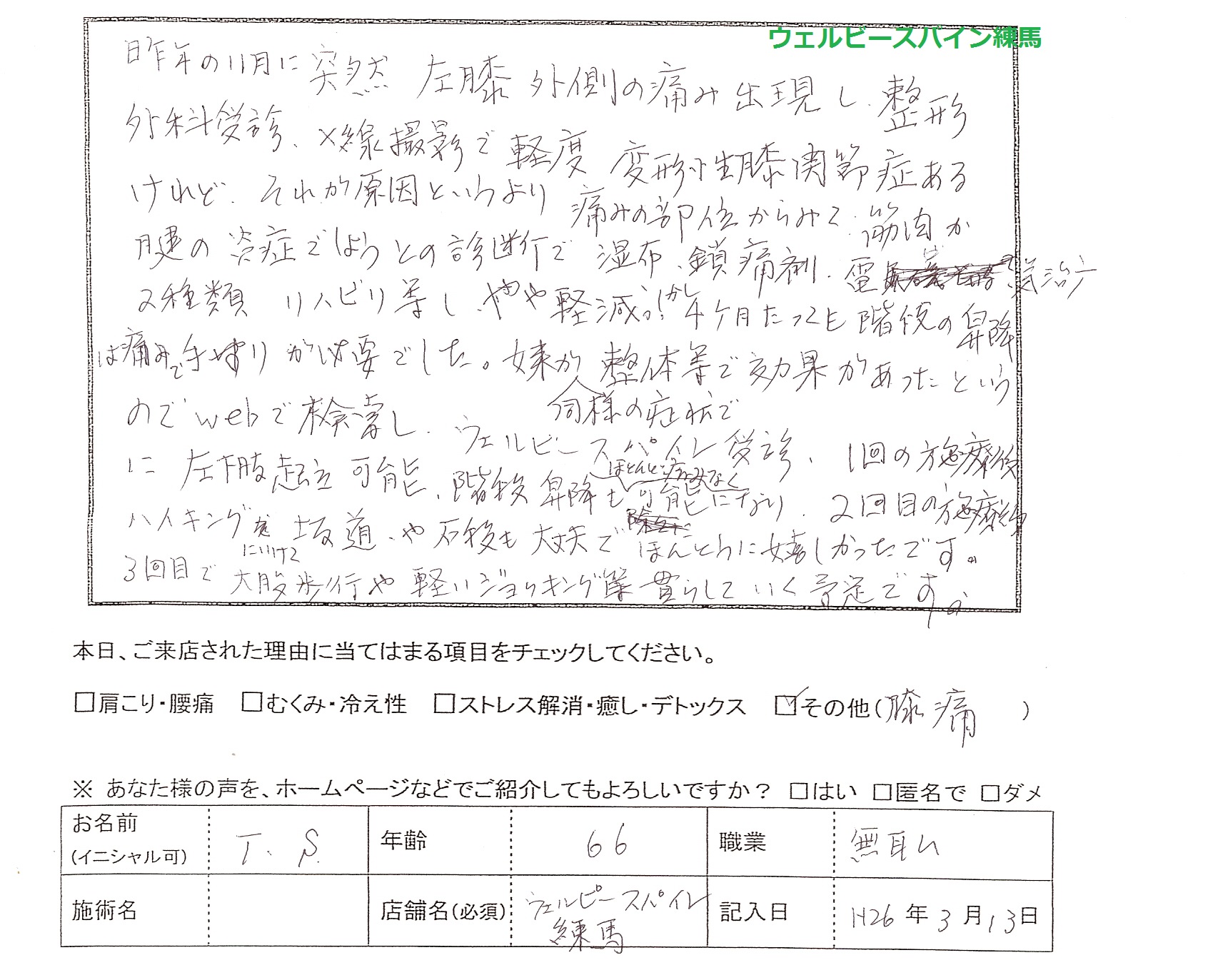 整体等で効果があったというのでwebで検索しウェルビースパインを受診。1回の施術後に左下肢起立可能、階段昇降もほとんど痛みなく可能になり、2回目の施術後はハイキングに行けて坂道や石段も不大丈夫で本当にうれしかったです。3回目で大股歩行や軽いジョギング等で慣らしていく予定です。