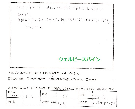 N.K.さんコメントありがとうございました。N.K.さんは腰痛や肩こりなどの症状はありませんでしたが、骨盤や背骨、顔の歪みを気にされていました。施術の時に説明いたしましたが、N.K.さんの骨盤は捻じれていて少し傾いていました。。骨盤は背骨の土台なので、これが傾いてしまうと背骨全体に影響が出て、将来的に腰痛や肩こりの症状が現れる可能性があります。それなので症状がなくても施術させていただきました。