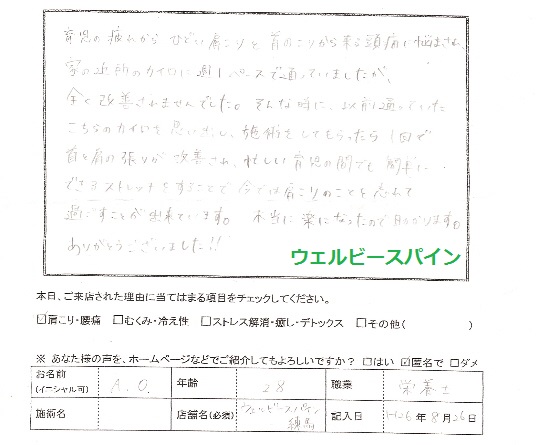 練馬 整体 WHO基準カイロプラクティック|ウェルビースパイン練馬 > ご利用者の声 > 産後の首肩こり 頭痛 (28歳女性 栄養士 西東京市)