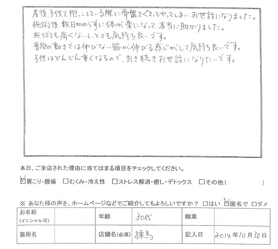 Kさん嬉しいお言葉ありがとうございました。最初来た時は歩くことこそ平気でしたが身体を動かすとほとんどの動きで痛みがありましたね。でも2,3日したらだいぶ腰・お尻の痛みも減っていました。2回目にお身体を触らせていただいた時に1回目とは違い、状態が良くなっててびっくりしました。まだまだお子さんの抱っこは続きますからね、この調子で定期的なケアを続けていきましょう。
