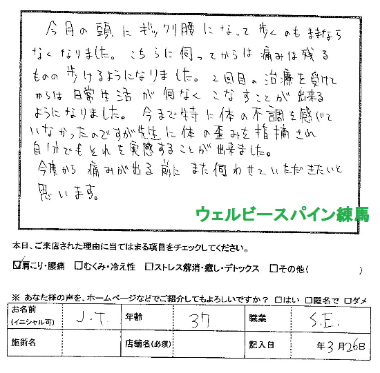 2回目の治療を受けてからは日常生活が難なくこなすことができるようになりました。今まで特に体の不調を感じていなかったのですが、先生に身体の歪みを指摘され自分でもそれを実感することができました。